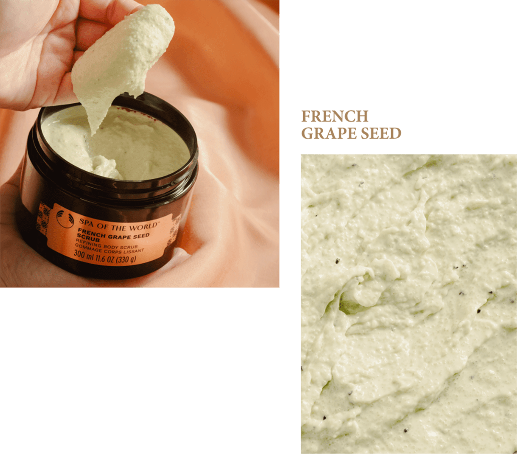 ザクザクとしたテクスチャーのオーガニックシュガー*1とグレープシードパウダー*2が古い角質を取り除き、肌を柔らかく、輝きの宿る明るく健康的な肌に整えます。