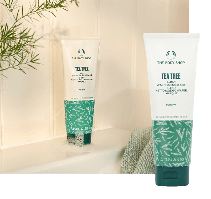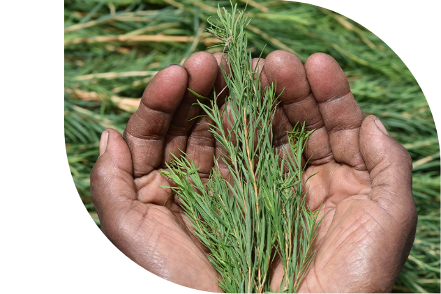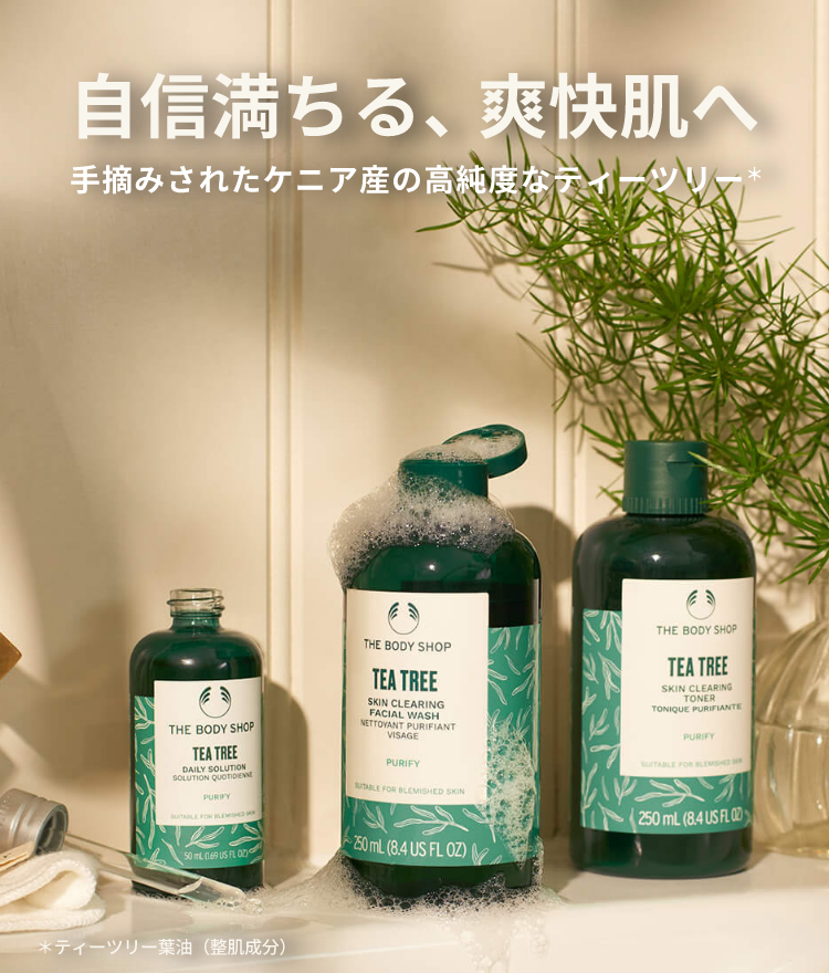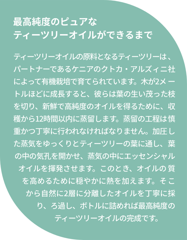ザボディショップのティーツリーオイルは、ケニア農村部の農場・農家からコミュニティフェアトレードで調達しています。サステナブルな方法で丁寧に生産された高品質のティーツリーオイルは、肌をリフレッシュさせる天然の清浄作用と一瞬で頭をクリアにするような爽快な香りで世界中の人々に愛されています。