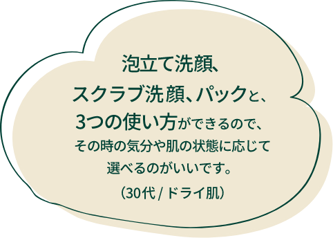 洗顔・スクラブ・マスク、3つの機能が1本に。カオリンクレイ*1をベースに、パーライト*2(火山ミネラル)、ホホバビーズ*3などを配合し、余分な皮脂や古い角質、毛穴汚れをすっきりオフ。明るくクリアな肌に洗い上げます。95%自然由来成分配合。