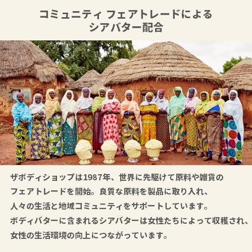 原料:熟したシアの実から丁寧に手作業で取り出されたシアバターは、天然の脂肪酸を豊富に含み、肌をやわらかくなめらかに整えます。